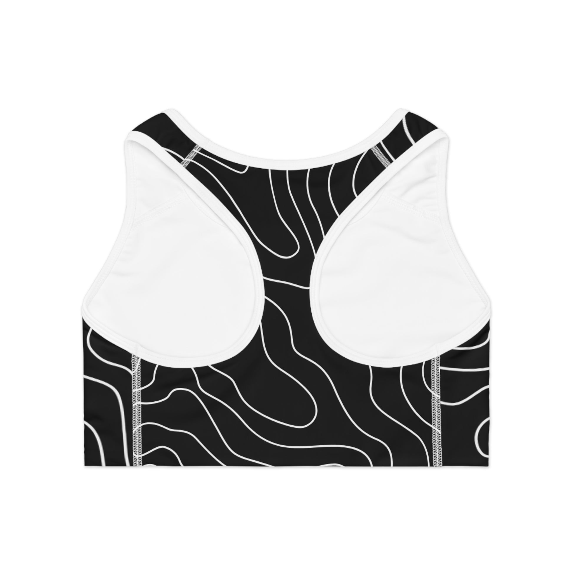 A sleek, all-over print sports bra inspired by contour maps and movement. The monochrome topographic lines create a modern, minimalist look that reads both athletic and urban. Designed for medium-impact activity, it hugs the body with a compression fit and a wide supportive elastic band so you can move with confidence. Moisture-wicking polyester keeps you cool as intensity rises, while the added spandex delivers stretch for yoga flows, runs, or everyday layering. The racerback cut and double-layer front provide focused support without bulk. Wear it under a jacket for commutes, pair it with high-waisted leggings for studio classes, or let it be the statement piece on casual off-duty days.