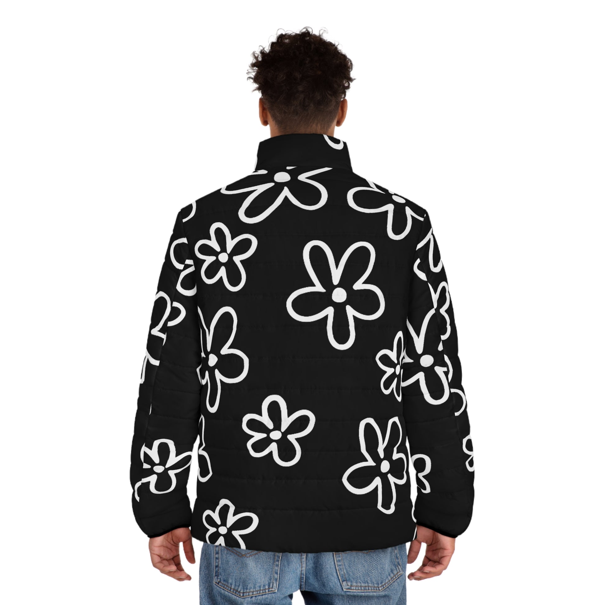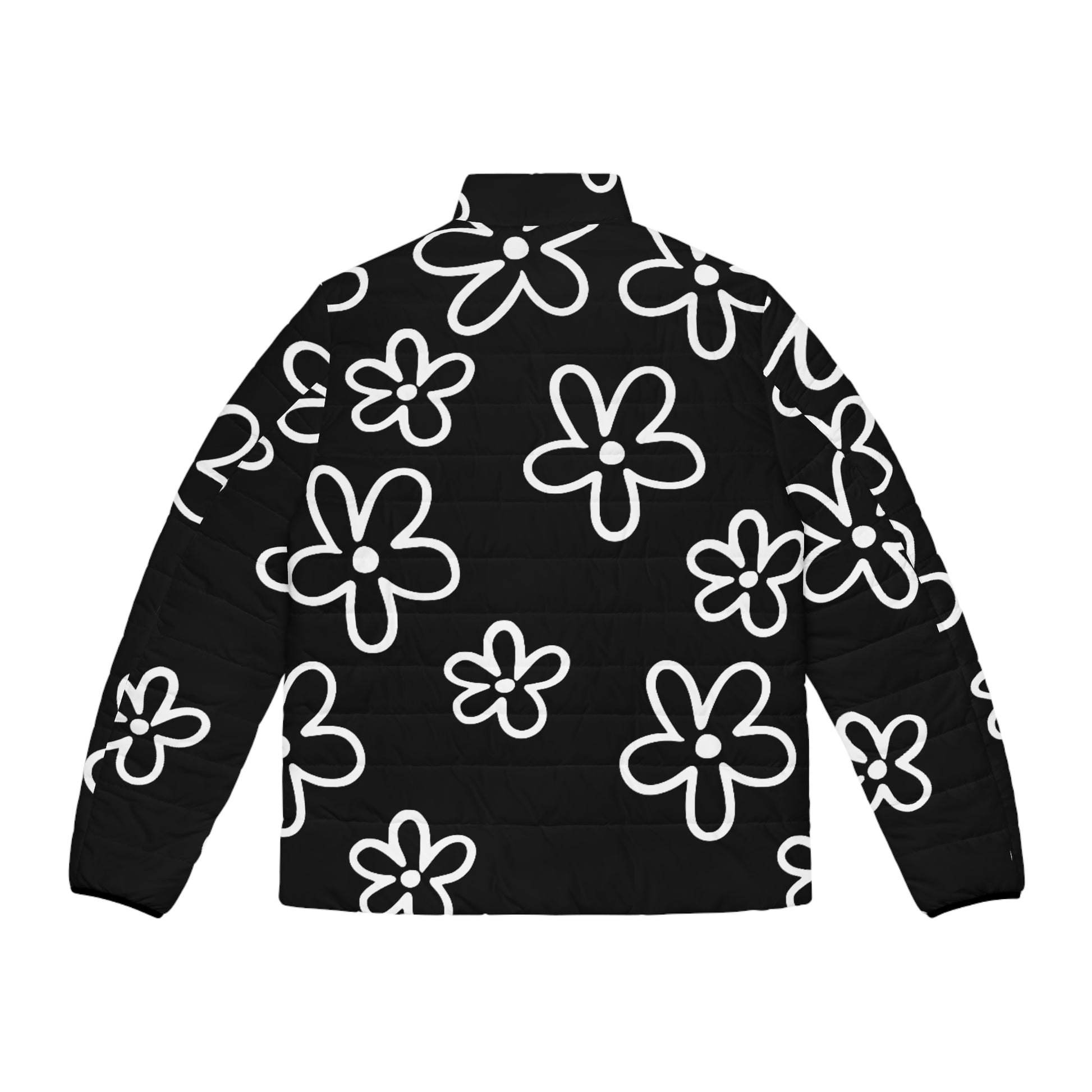A light, quilted puffer designed for everyday movement and bold style. The black shell is peppered with hand-drawn white flowers, a playful contrast that reads modern and expressive. It sits at the waist with a stand collar to block wind, elastic cuffs that keep warmth close, and roomy side pockets for your phone and gloves. The feel is soft and weightless — easy to throw on between errands, layered over a hoodie for chilly commutes, or paired with denim for nights out. This jacket speaks to someone who favors functional outerwear but isn’t afraid to wear a graphic that catches the eye. The durable polyester holds its shape and dries quickly, while the cotton-like black quilted lining keeps the silhouette structured and comfortable.