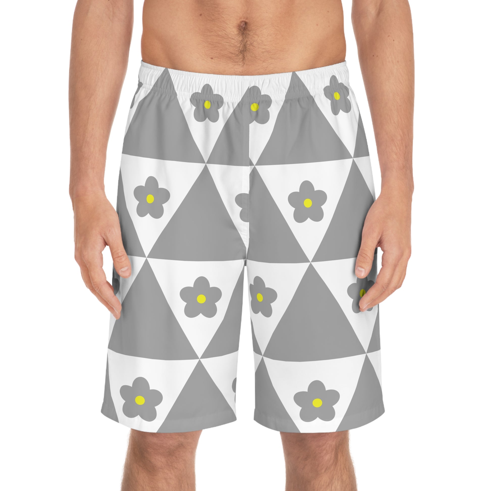 Floral Geo Board Shorts — Grey Triangle & Daisy Swim Trunks